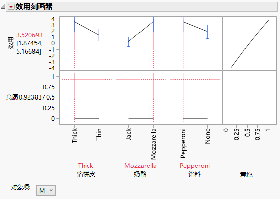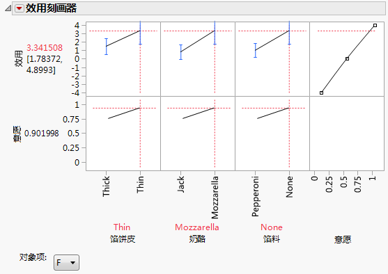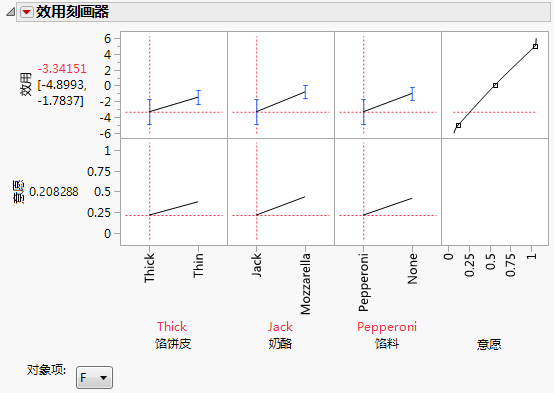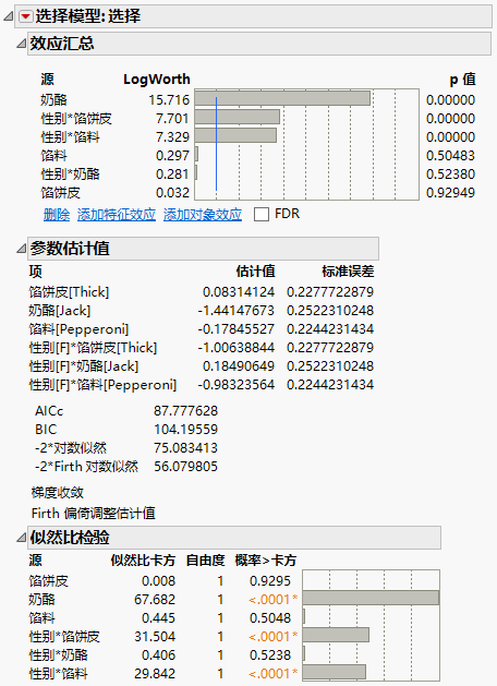 模型有六个效应。效应馅饼皮、奶酪和馅料是产品特性。交互作用效应 — 性别*馅饼皮、性别*奶酪和性别*馅料 — 是测试对象和产品特性的交互作用效应。分析这些交互作用效应,您可以打造不同的产品以满足不同细分市场的偏好。