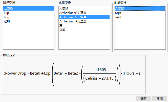 • 若您想要使用的模型不在数据表中,而您不想使用内置模型之一,那么您尚不能使用该模型规格。首先,创建模型,重新启动“退化”平台,然后返回列选择(列选择)。选择包含该模型的列,然后点击确定。您将返回“非线性路径模型规格”。有关该规格的所有功能的详细信息,请参见“模型规格”详细信息。