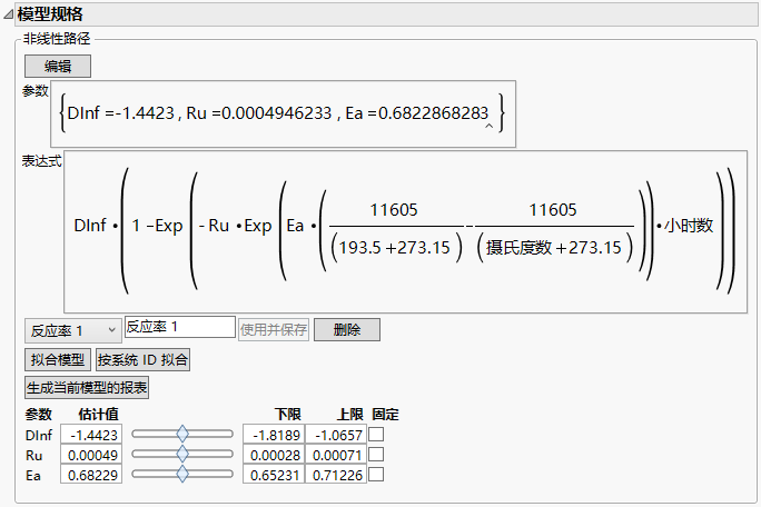 对于本例,请选择反应率,然后将“摄氏温度”选作“温度单位”。点击确定返回该报表。有关“模型规格”所有功能的详细信息,请参见“模型规格”详细信息。