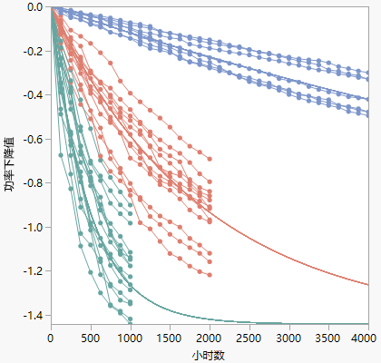 为便于解释“非线性路径模型规格”,请打开 Device B.jmp 数据表。该数据包含在四个温度水平上测量的 34 个单元的功率下降测量值。按以下步骤执行: