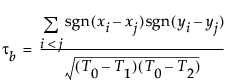 Kendall τb 系数基于一致对和不一致对的数目。若两个变量所对应的一对行对于哪一个变量较大这一点上保持一致,则认为这一对行一致。否则这一对行不一致或为同分对。