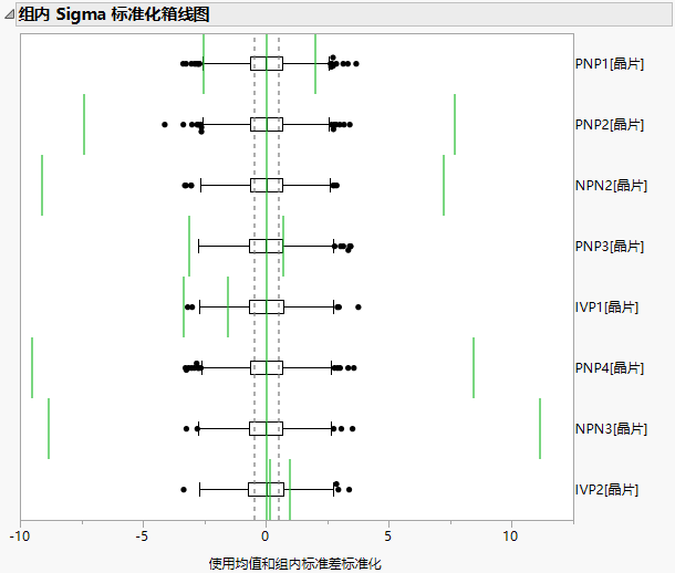 组内 Sigma 标准化箱线图 显示了在 Semiconductor Capability.jmp 样本数据表中使用晶片作为子组变量选择过程变量的“组内 Sigma 标准化箱线图”。