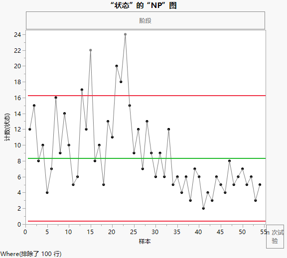 包括阶段变量意味着阶段 2 的控制限仅基于阶段 2 的数据。阶段 2 的所有观测都位于控制限内。因此,您可以推断出在作出调整后过程处于受控状态。