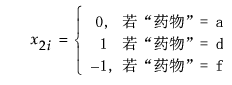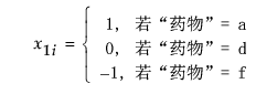第一个指标变量 x1 定义如下。请注意,药物 = a 为指标变量提供了值 1,药物 = d 提供了值 0,药物 = f 提供了值 –1: