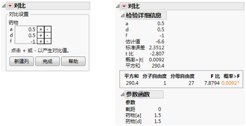 2. 点击药物 a 和药物 d 对应的 + 框,并点击药物 f 对应的 - 框,定义药物 a 和药物 d 的平均值与药物 f 之间的对比(如药物实验的对比示例 所示)。