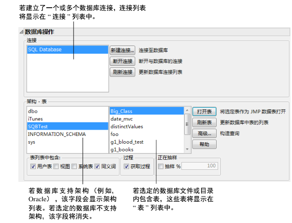 “连接”框列出 JMP 所连接的数据源。“架构 - 表”框列出了支持这些数据库的架构。