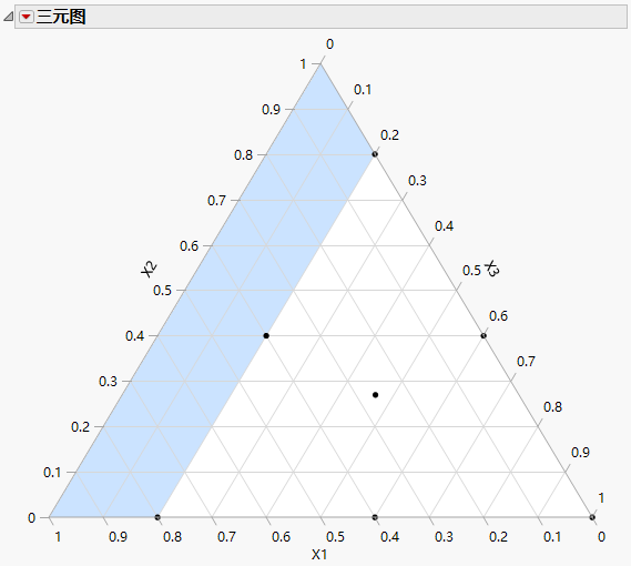 该三元图显示了构成设计的 7 个独特混料。着色指示受约束的区域。有关三元图的详细信息,请参见三元图概述。