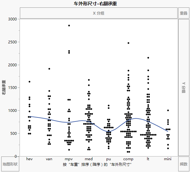 现在车外形尺寸的水平即按照车重均值降序排列。您想要查看右腿承重(右腿承重)是否随着车重降低。