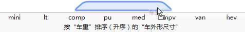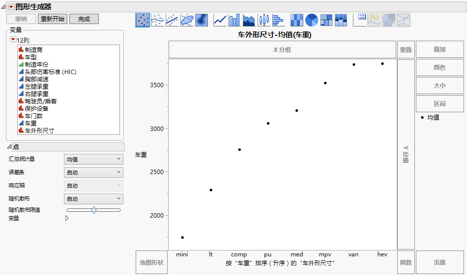车外形尺寸的各个水平现在依据水平中所有车辆的平均车重以升序排列。请注意:迷你型和轻型现在排在重型之前。轴标签随之更新,表明使用了一个排序变量。