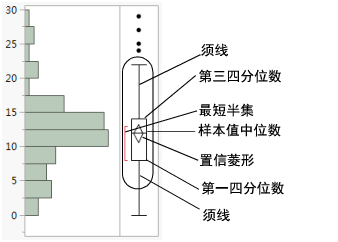 • 箱外部的方括号标识最短半集,这是最密集的 50% 的观测 (Rousseeuw and Leroy 1987)。