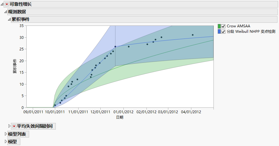 8. 点击“可靠性增长”红色小三角并选择拟合模型 > 分段 Weibull NHPP 变点检测。