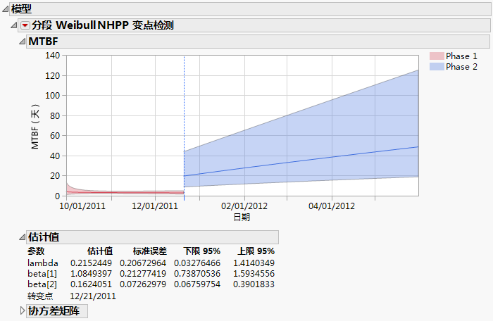 默认“分段 Weibull NHPP 变点检测”报表显示 MTBF 图、“估计值”和“协方差矩阵”。(请参见“分段 Weibull NHPP 变点检测”报表,它使用 Reliability 子文件夹下的 BrakeReliability.jmp 中的数据。) 请注意,显示在“估计值”报表底部的变点被估计为 12/21/2011。标准误差和置信区间将变点视为已知的。该图和“估计值”报表在分段 Weibull NHPP一节中进行介绍。