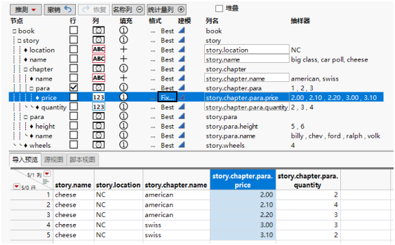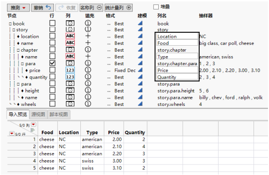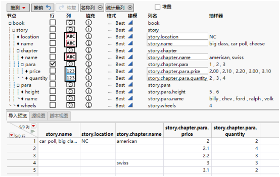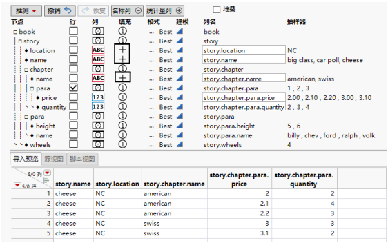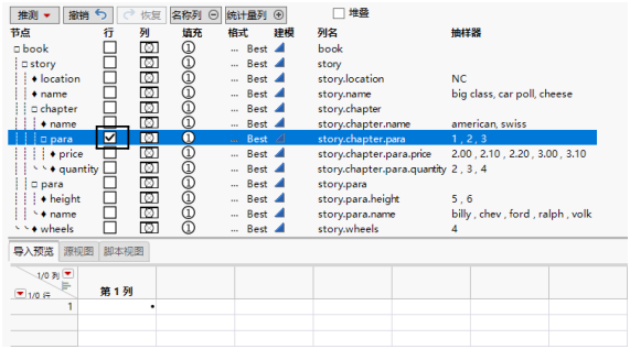 ‒ 您选择本例中的 +book/story 选项。该选项表明:若发现打开的 <book>/<story> 元素,JMP 会填充单元格一直到 <book>/<story> 节点重新开始。-<element> 选项引用该元素的结束标记,这将是该节点终止的点。