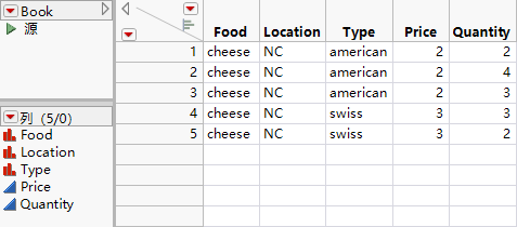 将每一行添加到数据表时,若没有为某列找到新值,JMP 将决定对下一行执行的操作。例如,若没有为每种 cheese 指定章节名称,则在“american”和“swiss”之后跟有缺失值。