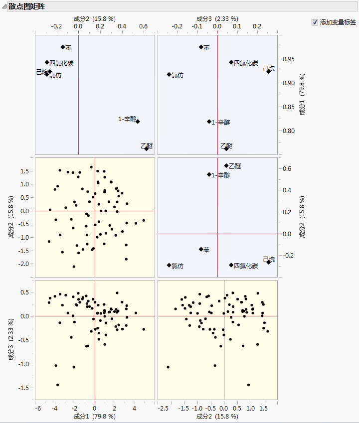 注意:显示在“散点图矩阵”中的载荷图矩阵是您选择“载荷图”选项时获得的载荷图矩阵的转置矩阵。
