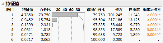 若从红色小三角菜单中选择 Bartlett 检验选项,将为每个特征值提供假设检验(Bartlett 检验)(Jackson, 2003)。