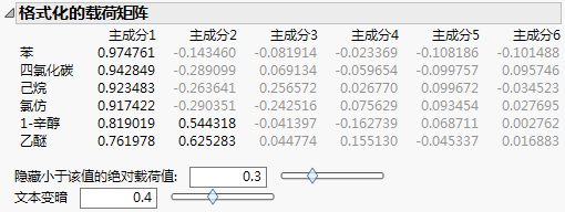 显示或隐藏每个成分的载荷表。这些值绘制到载荷图中。表值的透明度指示绝对载荷值与 0 之间的距离。越靠近 0 的绝对载荷值比远离 0 的绝对载荷值更加透明。
