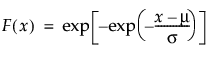 Returns the cumulative distribution function (cdf) evaluated at x of the smallest extreme distribution with location mu and scale sigma. The cdf is parameterized as follows: