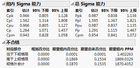 “过程汇总”报表显示了保存至“规格限”列属性的规格限。还显示了根据子组内变异计算的 sigma 估计值(组内 Sigma)与样本标准差给出的总估计值(总 Sigma)没有很大差异。因此,稳定性指标接近 1 (0.979268)。由于过程是稳定的,因此这是期望的结果。