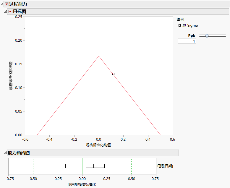 目标图显示“间距”的 Ppk 指标基本上等于 1。箱线图显示大部分值落入规格范围内,但数据值的大多数向规格范围内的右侧偏移。