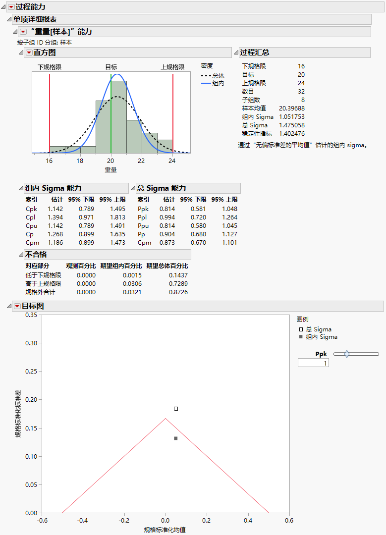 使用“总 Sigma”计算的点位于对应于 Ppk 为 1 的目标三角形之外。这表示变量重量将产生不合格产品。