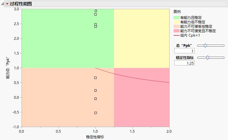 此外,图上有一条红线指示 Cpk 值为 1 的位置。可以使用图右侧的“Ppk”和“稳定性指标”滑块控件调节定义四个象限的边界。您还可以在“文件”>“首选项”>“平台”>“过程性能图”和“文件”>“首选项”>“平台”>“过程能力”中设置所需的“能力和稳定性”边界和稳定性评估类型的首选项。