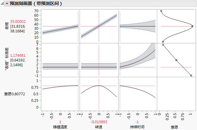 例如,假定目标是找到实现响应的目标值为 35 同时使方差最小的因子设置。拟合模型并从报表菜单中选择“刻画器”。例如,具有预测区间的“匹配目标值”和“最小化方差”的刻画器 显示匹配均值的目标值并使方差最小化的刻画器设置。