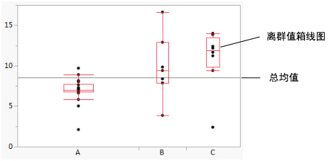 注意:要隐藏这些元素,请点击“单因子分析”旁边的红色小三角,然后选择显示选项 > 箱线图或总均值。