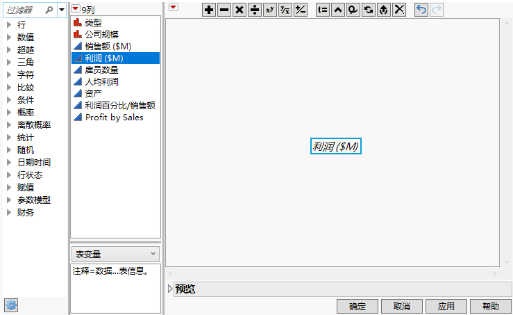 下例显示如何重新创建 Companies.jmp 样本数据表中的公式列。