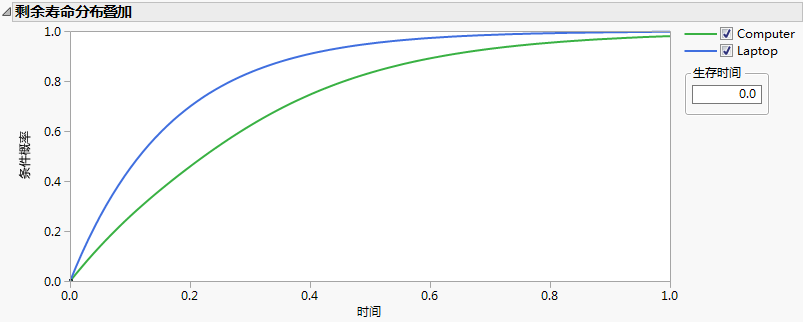 • “剩余寿命分布叠加”图显示“设计”面板中每个设计的失效条件概率,前提是系统存续到指定的生存时间。在图右侧的框中输入“生存时间”。或者,选择原点处的小矩形,并将其拖至右侧以便动态设置“生存时间”。