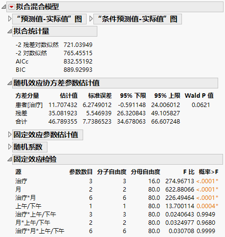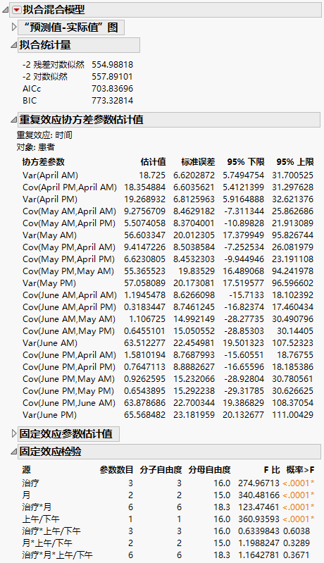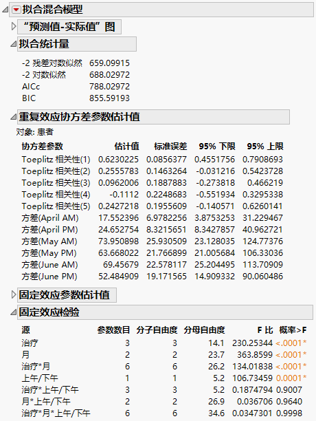 使用 AR(1) 结构进行进一步分析因为“AR(1)”模型给出最佳拟合,您采用它作为模型并继续分析。“固定效应检验”报表指示“治疗”和“月”之间有显著交互作用以及存在“上午/下午”主效应。下面我们来探索这些显著效应。