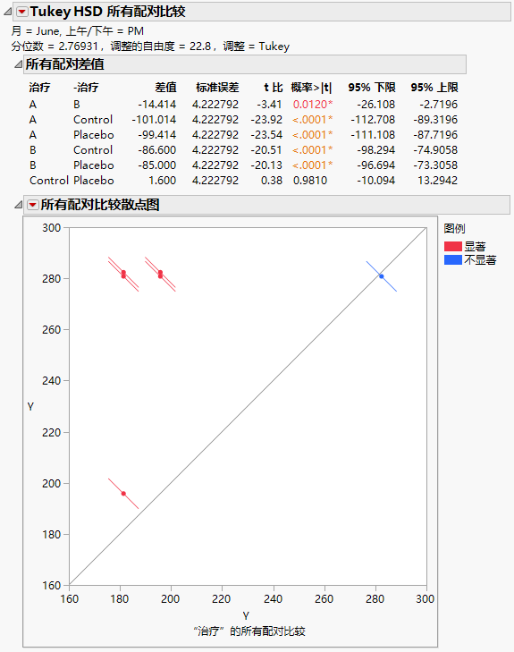 “Tukey HSD 所有配对比较”报表显示“所有配对差值”报表和“所有配对比较散点图”。在六月下午的测量值中,除了“Control”和“Placebo”之外的所有治疗均存在显著差异。