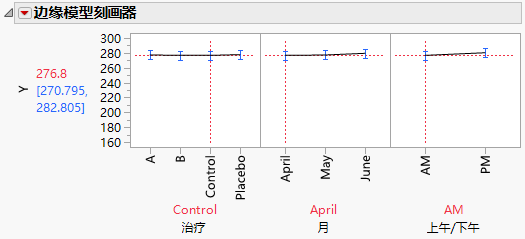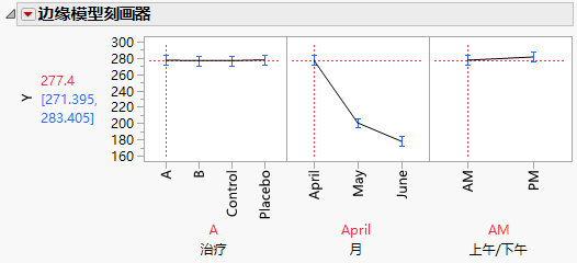 通过“边缘模型刻画器”报表(治疗 A 的边缘刻画器图),您可以查看治疗、月和上午/下午的各种设置对胆固醇水平 (Y) 的效应。