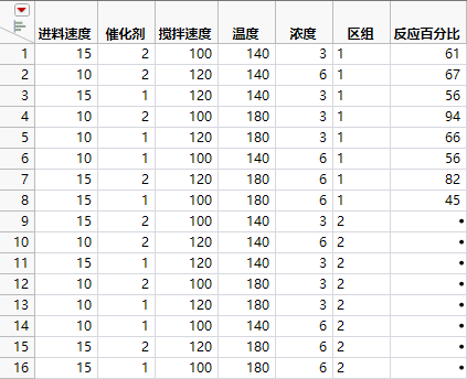 最初的 8 次试验位于“区组 1”中,重复的试验位于“区组 2”中。