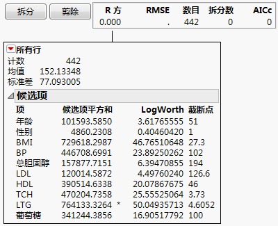 对于每列,“候选项”报表都提供有关该列的最优拆分的详细信息。用星号标记所有列上的最优拆分。