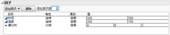连同温度约束,这会禁止使用催化剂为 B 且温度值低于 400 的因子设置。