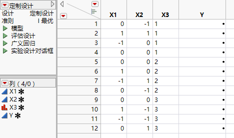 由于默认的“试验顺序”为“区组内随机”,分区组因子 (X3) 的水平经过排序。