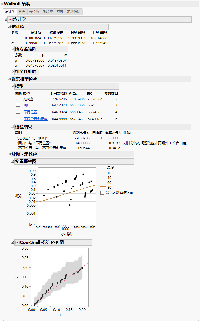 若在启动窗口中未选中“嵌套模型检验”选项,则不评估不同位置和尺度和不同位置模型。在这种情况下,会为您选择的每个分布的回归模型提供估计值,并且“Cox-Snell 残差 P-P 图”是唯一的诊断图。
