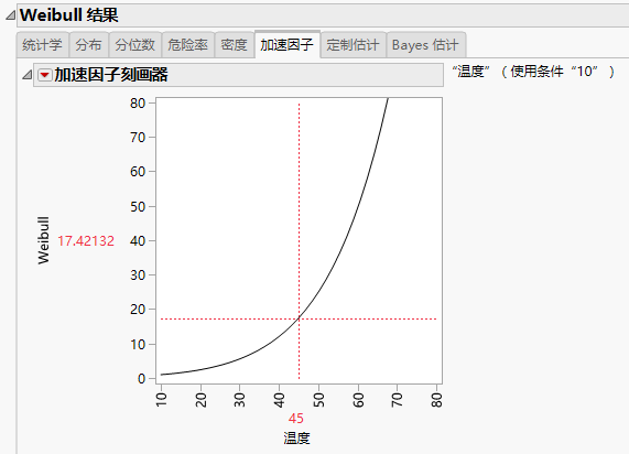 该报表窗口还包括标记为加速因子的选项卡。点击加速因子选项卡可显示“加速因子刻画器”。该刻画器显示的是该报表窗口的“比较”部分中加速因子选项卡下方显示的 Weibull 图的放大版本。Devalt.jmp 的 Weibull“加速因子刻画器” 显示了 Devalt.jmp 的 Weibull 分布的“加速因子刻画器”。通过从“以 X 拟合寿命”红色小三角菜单中选择设置时间加速使用条件选项,可以修改解释变量的使用条件水平。
