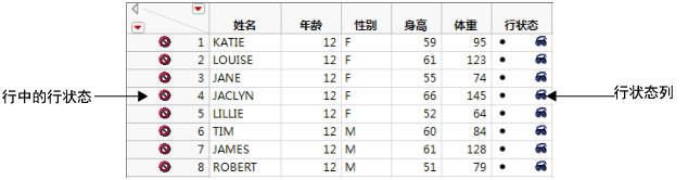 类似于为行指定行状态,您可以创建一个仅包含行状态信息的列。行状态列存储有关行是否已排除、已隐藏、已添加标签、已着色、已标记或已选定的信息。要将某列指定为行状态列,请在“列信息”窗口中的数据类型旁边,选择行状态。