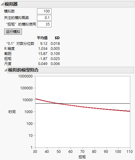 现在很容易看到围绕 35 次正常使用条件的模拟拟合中的变异性。您期望在正常使用条件的估计值中看到变异性。模拟可帮助您评估您的 ALT 计划是否可接受。若变异过多,您可能需要增加试验的单元数或试验条件。