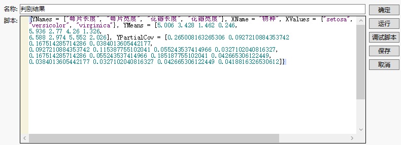 保存判别矩阵会创建一个全局列表 (判别结果) 以供在 JMP 脚本语言中使用。该列表包含以下为训练集计算的信息: