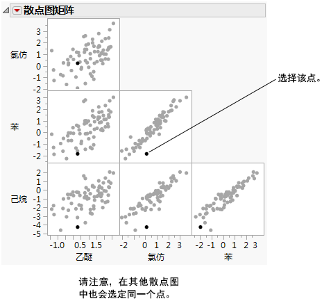 若您在一个散点图中选择某个点,在其他散点图中该点也会被选择。