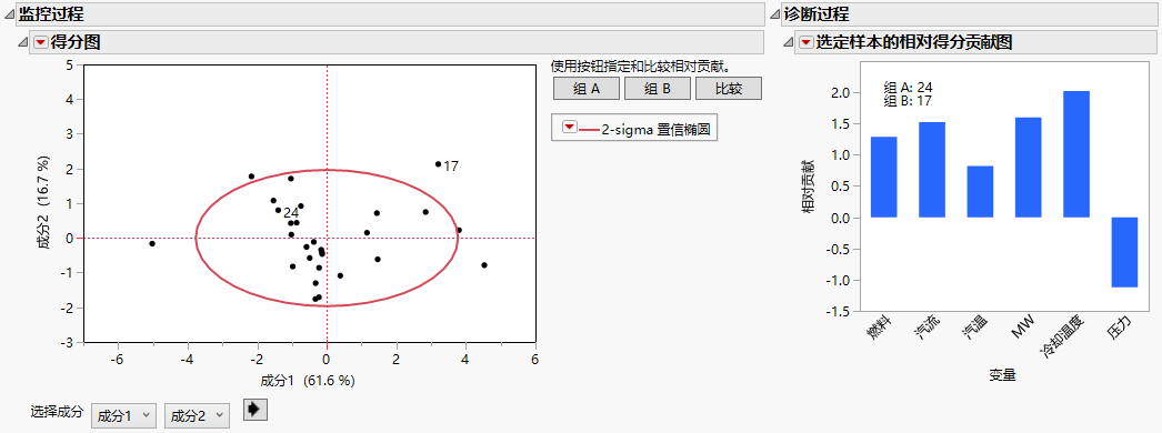 使用图右侧的按钮分配和比较两组点之间的相对贡献。相对贡献显示两个或更多样本之间的差异。相对贡献显示基础过程变量中的哪些变化导致了样本组之间的差异。一个用途是调查受控样本与失控样本之间的差异。