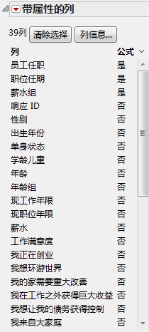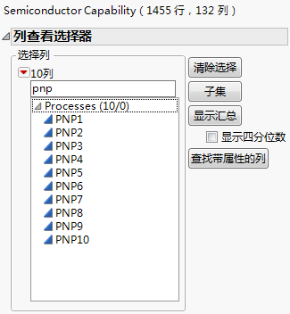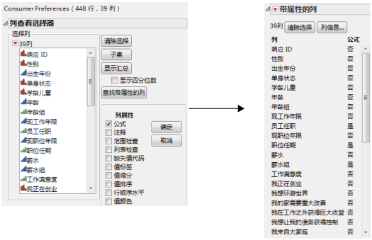 “列”菜单中的“列查看器”选项可帮助您按照特性、属性和统计量选择列,特别是在有许多列的数据表中。您可以查看这些列的汇总统计量和属性、查看汇总统计量中的四分位数、对数据取子集,以及执行其他操作。而且“列查看器”窗口中的列还链接至数据表列。