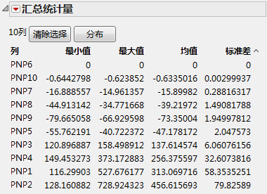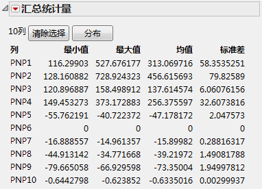 请注意,PNP6 没有标准差,因为最小值、最大值和均值均为 0。