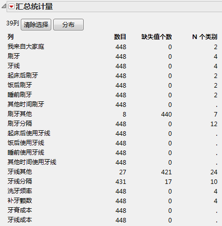 使用“列查看器”可以快速查看数据表特征。例如,“汇总统计量”报表显示哪些列包含缺失值。您可以在报表中选择这些列,然后从数据表中排除它们。