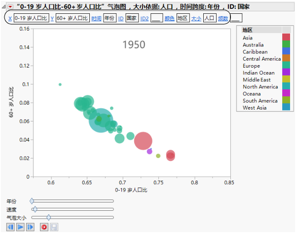 请按动态气泡图的示例中的说明来生成选定了“显示角色”的气泡图的示例 中所示的报表窗口。(这些颜色为 JMP 默认颜色。)