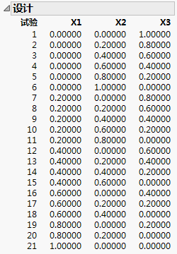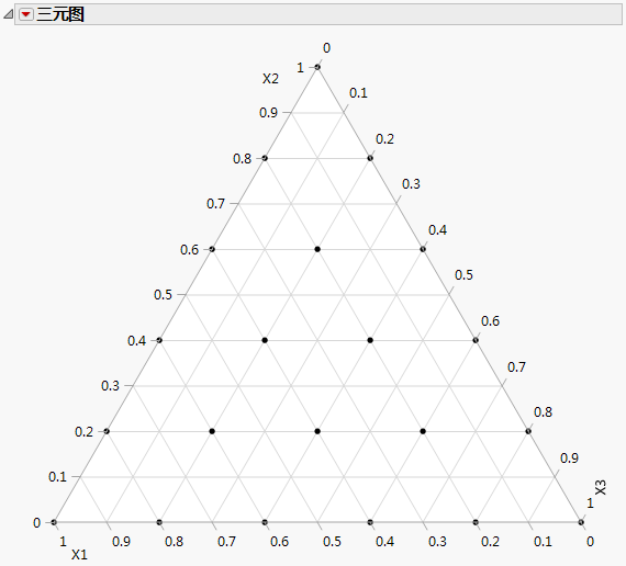 单纯形格点设计是一种空间填充设计,它可以创建三角形网格形式的试验。该设计是混合集,其中因子的值是 i/m,其中 i 的范围为 0 到 m,因子和为 1。对于三水平设计,可以在 0、0.33、0.66 或 1 处设置因子。