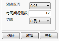 定制平滑权重 中显示的示例具有固定为 0.3 的水平权重 (α),界限为 0.1 和 0.8 的趋势权重 (γ)。在该例中,趋势权重的值可以在范围 0.1-0.8 内变动,而水平权重则固定为 0.3。请注意,您可以使用这些定制约束预先指定所有平滑权重。这样就不用从数据估计权重,尽管仍计算预测和残差。